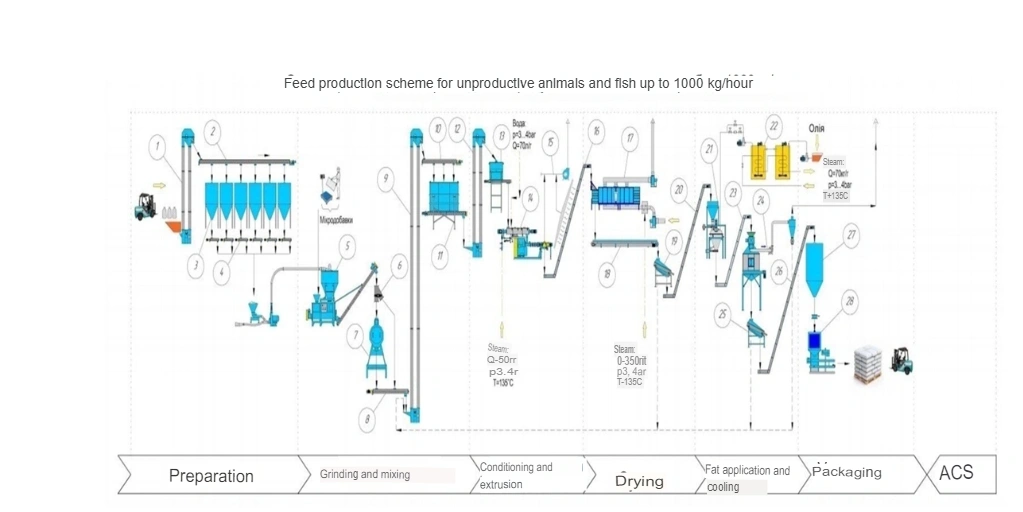 The technological process for the production of extrusion feed consists of several stages, including preparation of raw materials, mixing of raw materials, direct extrusion, cutting, drying, adding flavoring additives, cooling, and packaging of finished feed.