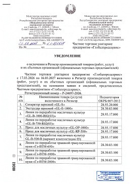 We recommend the private enterprise Globalprodservice as a reliable and trusted partner for cooperation in the supply of sophisticated modern equipment in the agro-industrial complex.