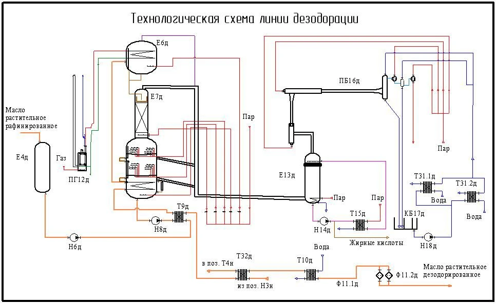 Все компоненты системы имеют высокий уровень прочности и рассчитаны на постоянное использование. Дезодорированное масло в нижней секции дезодоратора при барботаже острого пара охлаждается за счет нагрева входящего масла. Внизу Е7д происходит охлаждение масла. Продукт передается насосом Р8д из резервуара Е7д в теплообменник Т9д, где температура снижается. После этого, масло остужается с помощью воды в емкости Т10д, после чего, подается в фильтры Ф11д или Ф12д. После проведения всех этих операций, вещество отправляется на хранение. Охлажденное растительное масло прокачивается через один из полицейских фильтров и откачивается на хранение. Благодаря этой схеме, дезодоратор масла обеспечивает высокий уровень эффективности при сохранении всех полезных свойств этого продукта.