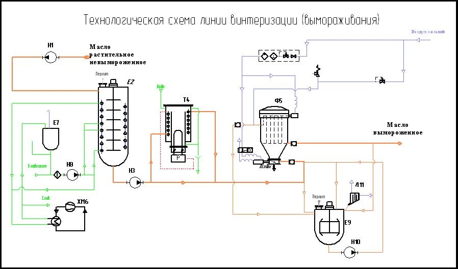 Шаг 1. Невымороженное (неочищенное) масло поступает в кристаллизатор E2 с помощью насоса Н1, в который подается перлитовый порошок. В кристаллизаторе Е2 масло охлаждается хладагентом до 6°С. После, происходит передача вещества в резервуаре Е7, откуда охлаждающий агент направляется в холодильную машину ХМ6, снижающий температуру до необходимого показателя. Процесс охлаждения длится не менее 12 часов. В течение этого времени, при медленном перемешивании масла, происходит образование, кристаллизация и рост кристаллов воска. Это значительно облегчает процесс отделения примесей посредством фильтрации. Фильтры соединены с общей системой, что автоматизирует весь процесс.