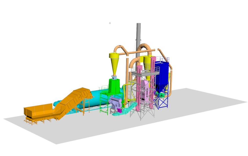 - В сушильном барабане (3) происходит влагообмен теплоносителя с высушиваемой биомассой, равномерно подаваемой с приемника – дозатора сырья (1).