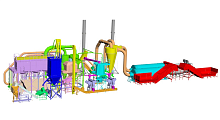 - Высушенный материал подается на измельчитель (6) затем перемалывается до фракции 0,1-0,5 диаметра отверстий матрицы и посредством системы пневмотранспорта (7) и транспортера (8) подается в оперативный бункер (10).