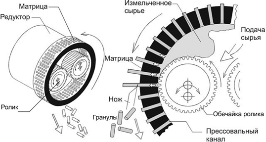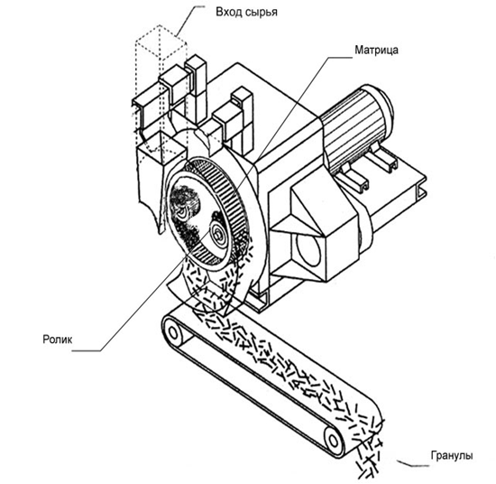 - Предварительно измельченный, гомогенизированный материал подается внутрь матрицы снаружи сверху, попадает в зазор между внутренней поверхностью матрицы и роликами и запрессовывается в отверстия матрицы.